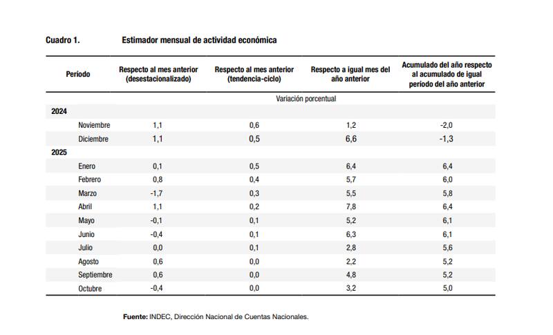 La publicación del EMAE de octubre funciona como una actualización de alta frecuencia del informe trimestral del PIB difundido días atrás por el organismo estadístico. Mientras que el avance del nivel de actividad del tercer trimestre reflejó una mejora interanual de 3,3%, sostenida por la intermediación financiera, la minería y los servicios, el indicador mensual permite observar con mayor precisión el comportamiento posterior y confirma que la recuperación perdió tracción hacia el inicio del último tramo del año.