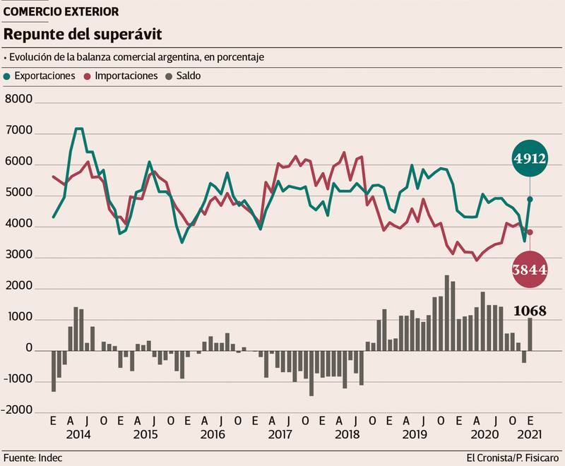 Según informó esta tarde el Instituto Nacional de Estadística y Censos (Indec), las exportaciones en el primer mes del año llegaron a u$s 4912 millones, un 7,3% más que en enero de 2020, mientras que las importaciones alcanzaron los u$s 3844 millones, una suba del 8,7% interanual.