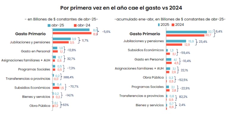 Un informe de la consultora Analytica reveló que en abril por primera vez en el año el gasto público devengado cayó respecto a 2024 -disminución del 5,6% interanual medido en precios constante-. Pero a pesar de ello, en el acumulado del primer cuatrimestre se incrementó en 6,4% comparado con igual período del año pasado.