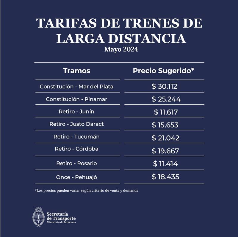 La Resolución 1/2024 de la Secretaría de Transporte postula también la propuesta de incremento del 54% para los trenes de larga distancia y regionales, tanto en lo que refiere a su carácter mínimo como máximo.