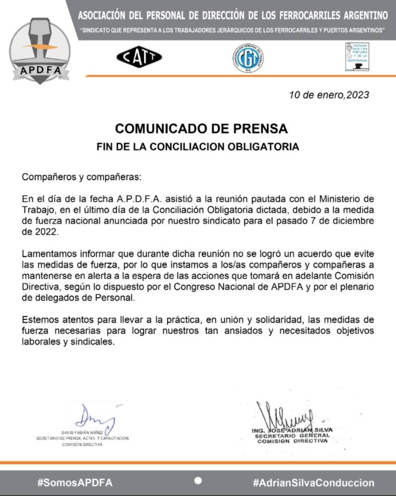 La Asociación del Personal de Dirección de los Ferrocarriles y Puertos Argentinos (APDFA) definirá en las próximas horas "las nuevas medidas de fuerza necesarias" sin descarte de un paro nacional de trenes, subtes y premetro ante el fracaso de la instancia de negociación convocada por el Ministerio de Trabajo, Empleo y Seguridad Social.