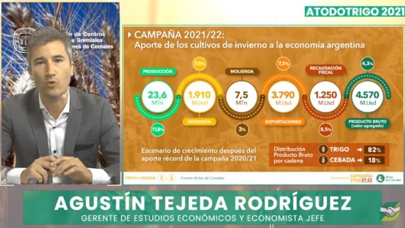 "De concretarse estas estimaciones, el Producto Bruto de ambas cadenas alcanzaría los u$s 4570 millones durante la campaña 2021/22, y las exportaciones de trigo y cebada se elevarían a u$s 3790 millones", señaló la Bolsa de Cereales de Buenos Aires, durante el lanzamiento de la Campaña Fina 2021/22.