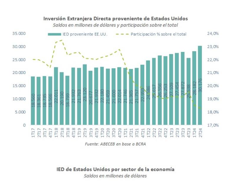 Desde la Cámara de Comercio de Estados Unidos en la Argentina (Amcham) definen la IED como "inconsistente con el nivel potencial de inversiones que tiene un país como la Argentina". Y eso pese a que un informe de Abeceb cataloga a Estados Unidos como el principal inversor del país, con u$s 30.000 millones y una participación que supera el 18% del total. Los porcentajes indican que casi un tercio de esa IED se destina a la extracción de petróleo crudo y gas natural (u$s 9.278 M), seguida por la industria manufacturera (u$s 6.327 M), telecomunicaciones (u$s 3.229 M) y el comercio automotriz (u$s2.515 M).