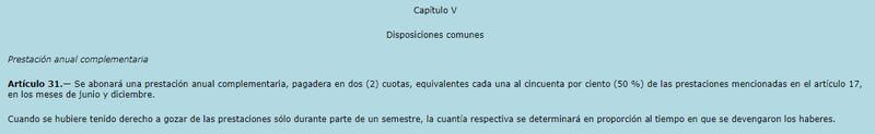 El capítulo V de la Ley 24.241 del SIPA en el artículo 31 define la liquidación de una Prestación Anual Complementaria, pagadera en dos cuotas, equivalentes cada una al 50%, en los meses de junio y diciembre.