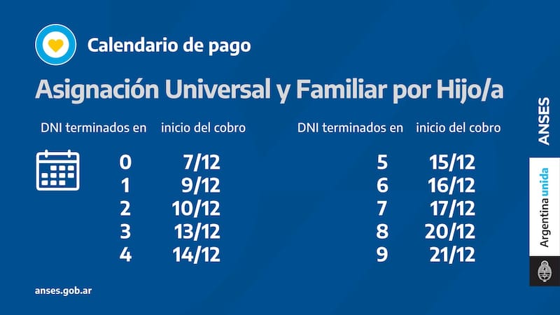 ANSES pagará el tercer Complemento para SUAF de forma automática en la misma fecha y cuenta en la que se cobra la Asignación Familiar. "El calendario de pago de diciembre empieza el 7/12, según la terminación de DNI".