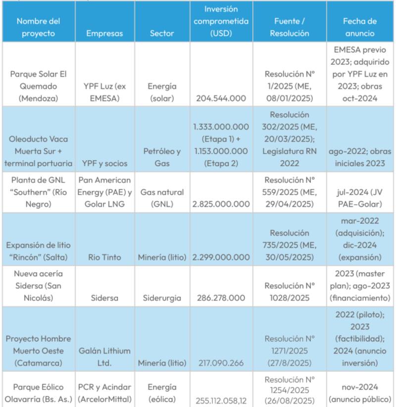 Además, el estudio indica que de los siete proyectos aprobados, solo uno fue concebido después de su sanción, lo que evidencia que el régimen ha beneficiado principalmente a empresas con planes ya en marcha, sin generar el "aluvión" de nuevas inversiones prometido por el Gobierno.