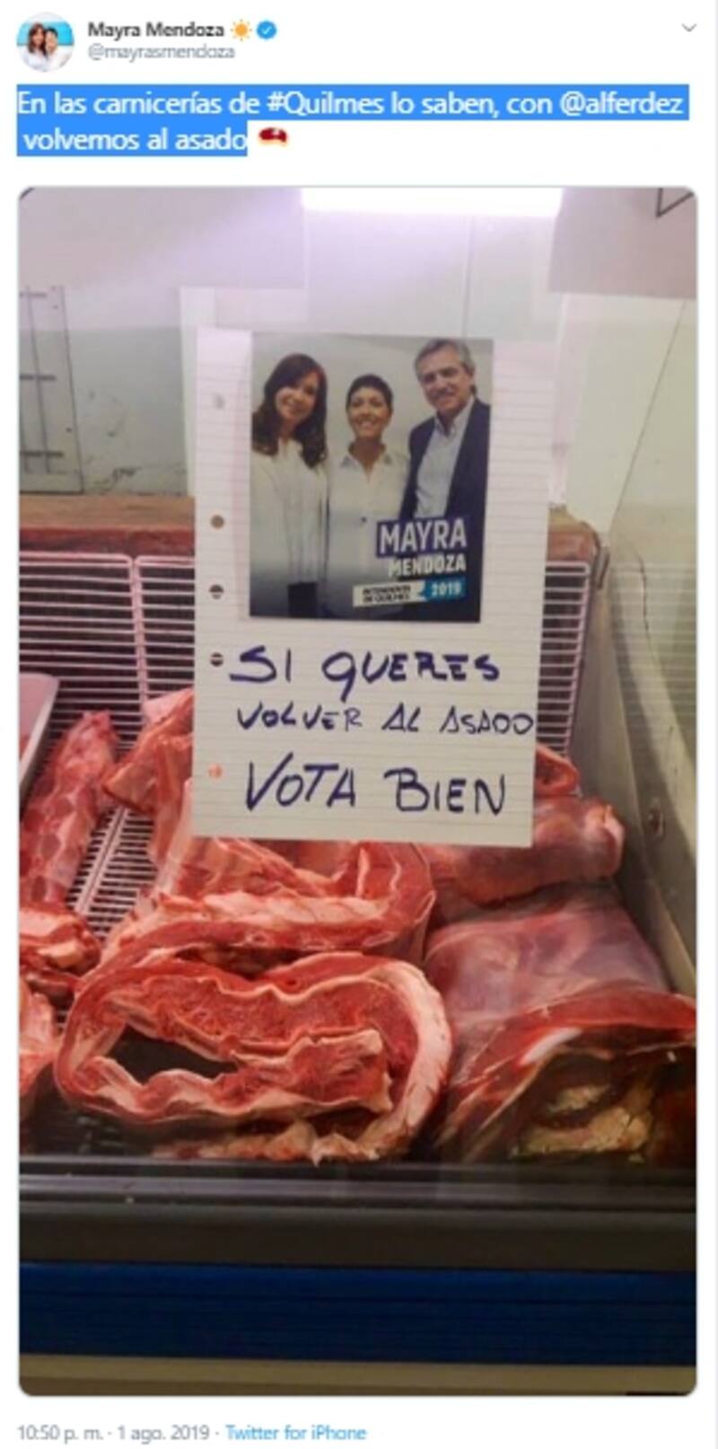En su cuenta personal de Twitter, la intendente de Quilmes, Mayra Mendoza (@mayrasmendoza) remarcó en agosto pasado: “En las carnicerías de #Quilmes lo saben, con @alferdez (Alberto Fernández) volvemos al asado .