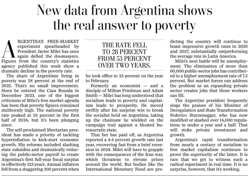 Bajo el título “Nuevos datos de Argentina muestran la respuesta real a la pobreza”, el editorial de The Washington Post asegura que “el experimento de libre mercado de Argentina encabezado por el presidente Javier Milei ha una vez más desafiado a los agoreros”.