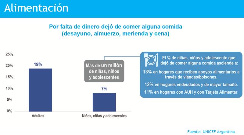 "Más de un millón de chicos dejó de comer alguna comida", detalló Sebastián Waisgrais, especialista en Inclusión Social y Monitoreo de Unicef Argentina. "En los adultos son 3 millones los que dejan de comer una de las cuatro comidas, muchas veces para que coman los chicos", agregó.