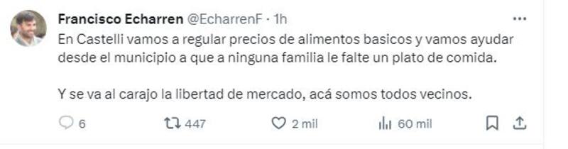 "En Castelli vamos a regular precios de alimentos básicos y vamos a ayudar desde el municipio a que a ninguna familia le falte un plato de comida", escribió. "Y se va al carajo la libertad de mercado, acá somos todos vecinos", agregó.