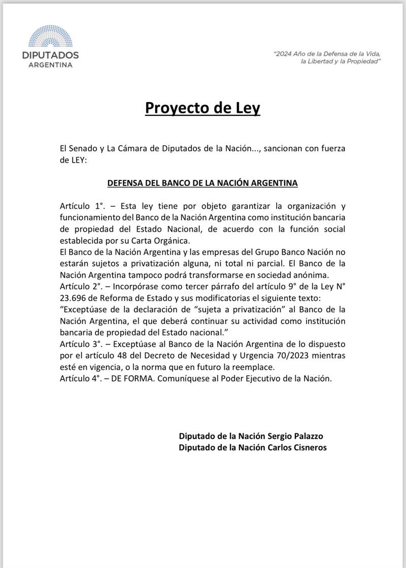 La norma plantea, además: "Incorpórase como tercer párrafo del artículo 9° de la Ley N° 23.696 de Reforma de Estado y sus modificatorias el siguiente texto: ‘Exceptúese de la declaración de "sujeta a privatización" al Banco de la Nación Argentina, el que deberá continuar su actividad como institución bancaria de propiedad del Estado nacional". Y "exceptúase al Banco de la Nación Argentina de lo dispuesto por el artículo 48 del Decreto de Necesidad y Urgencia 70/2023 mientras esté en vigencia, o la norma que en futuro la reemplace".