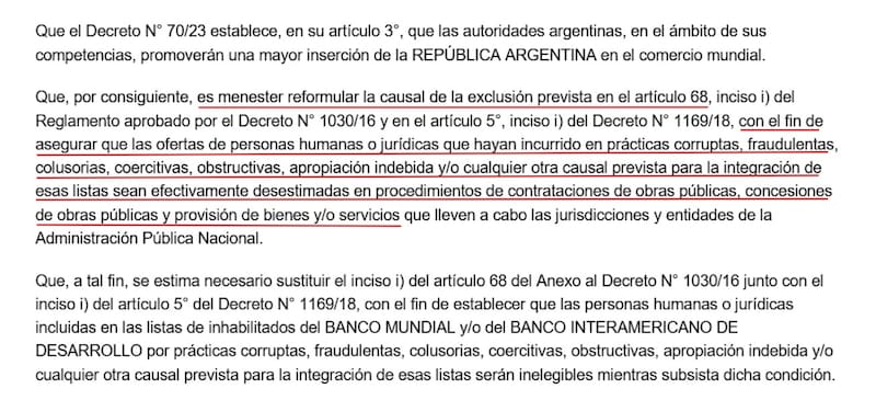 Hasta ahora, las causales de inelegibilidad estaban estrictamente atadas a supuestos de cohecho o soborno transnacional. Esa limitación generaba problemas operativos: las listas de empresas inhabilitadas tanto del Banco Mundial como del BID no siempre detallan el tipo penal específico que motivó la sanción. Esa ambigüedad dejaba márgenes para impugnaciones, incluso cuando se trataba de firmas sancionadas por prácticas graves cometidas en el extranjero.