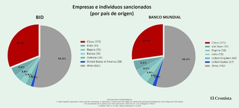 Sin embargo, hay un dato que emerge con claridad de la composición de esas listas. China aparece, por amplio margen, como el principal país de origen de empresas e individuos sancionados tanto por el Banco Mundial como por el BID. En ambos casos, el peso relativo del gigante asiático supera de forma holgada al del resto de los países, y en la mayoría de los registros las sanciones no responden a hechos de corrupción clásica, sino a los tipos de conductas que ahora incorpora el Decreto 5/2026.