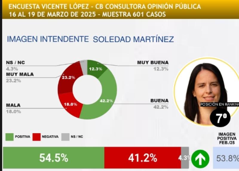 Entre los que tienen buena valoración se cuela la intendenta de Vicente López, Soledad Martínez, que posee 54% de imagen positiva y un diferencial de +13 respecto de quienes la cuestionan.