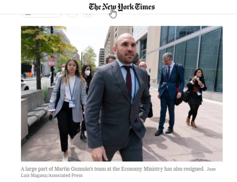 "El ministro de Economía de Argentina dimitió abruptamente el sábado por la noche, una medida que amenaza con desestabilizar aún más una economía ya sacudida por una inflación desorbitada, el aumento de los costes de la energía y el creciente temor a posibles nuevos impagos de la deuda", así comenzó The New York Times su artículo sobre la salida de Martín Guzmán.
