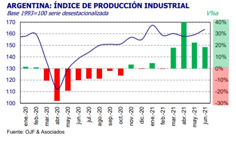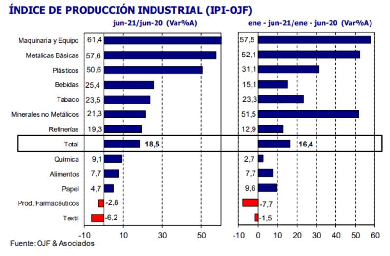 El Índice de Producción Industrial (IPI) que elabora el estudio Orlando Ferreres y Asociados (OJF) cerró en junio con un avance del 18,5% en comparación al mismo mes de 2020, y un incremento de 16,4% en el primer semestre.