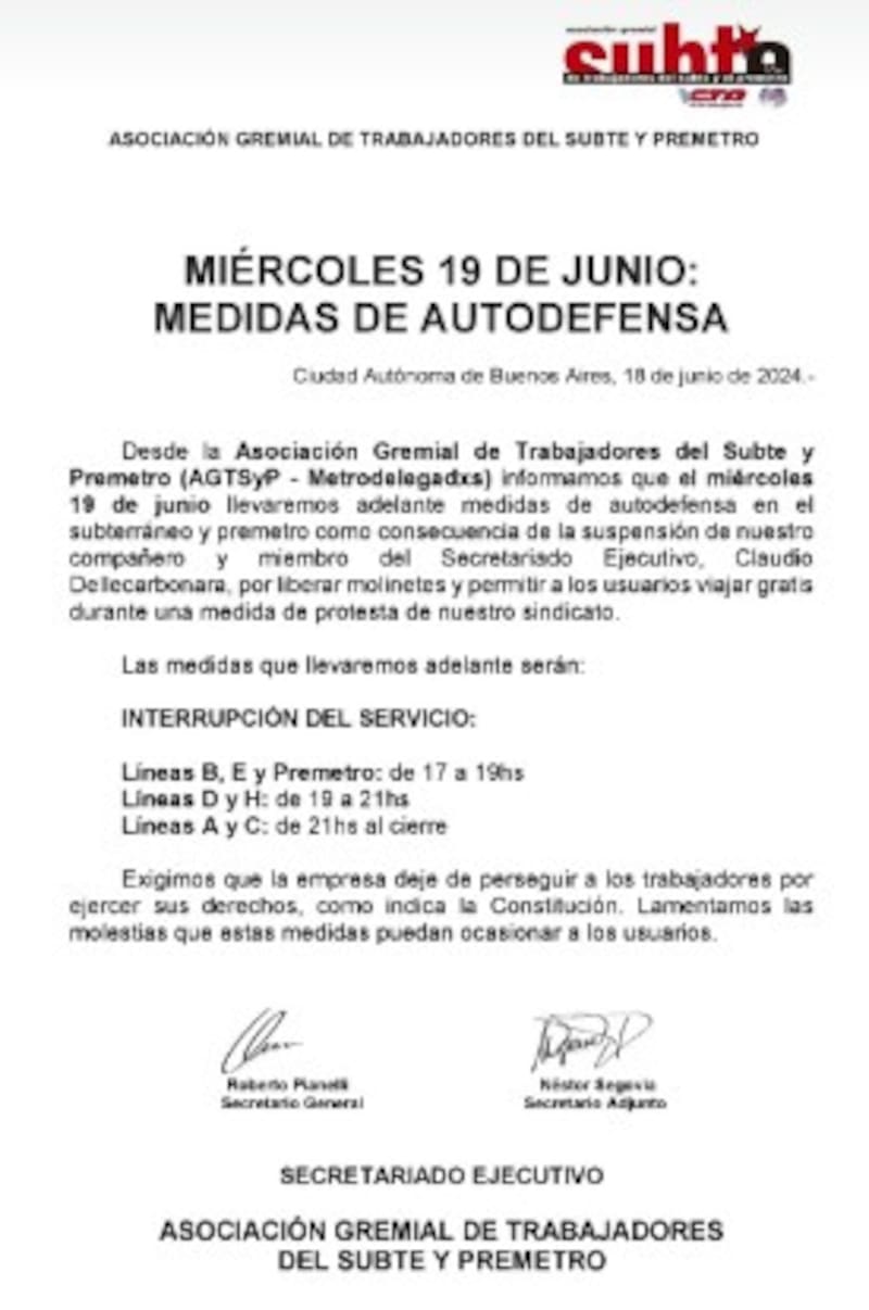 "Finalmente después de participar en una audiencia en la Subsecretaria de Trabajo de la Ciudad para instar a Emova para que retrotraiga la sanción fraudulenta contra Claudio Dellecarbonara, y al no obtener respuesta satisfactoria a nuestro reclamo anunciamos que el día miércoles 19 realizaremos medidas de paralización del servicio en las 6 líneas de subte", informaron desde AGTSyP.