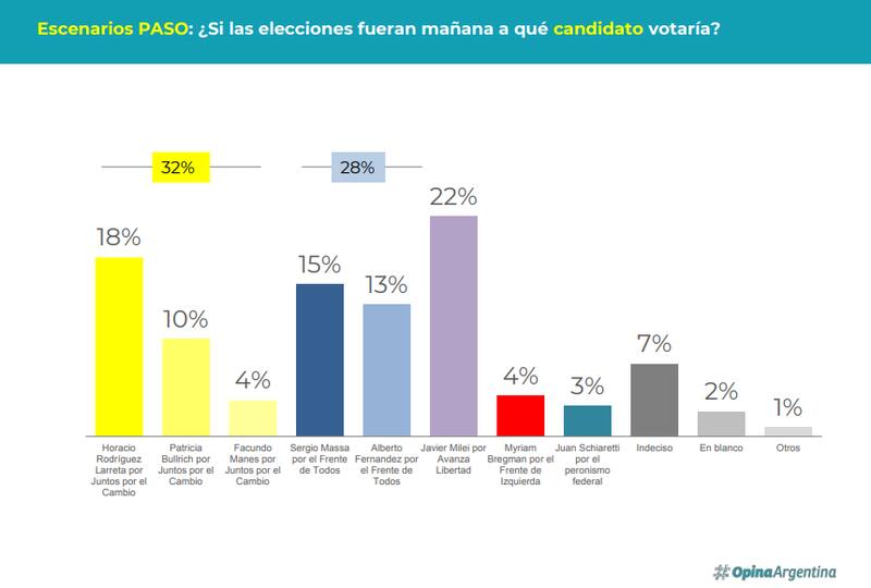 La coalición opositora quedaría primera, con un global de 32% si se juntan los votos de Larreta, Patricia Bullrich y Facundo Manes, mientras que el oficialismo sumaría 28 puntos con Massa, que ganaría la interna, y Alberto Fernández.