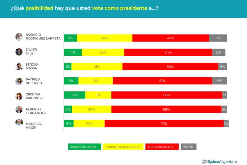 Opina Argentina midió tanto la intención de voto de cada candidato individualmente como también unas virtuales PASO donde no compita la vicepresidenta, Cristina Kirchner, que según informó no irá por ningún cargo, pero a la que la militancia quiere hacer cambiar de opinión.