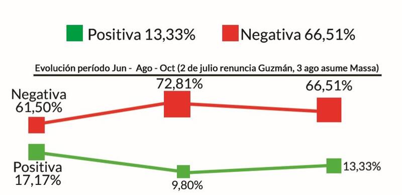La gestión del Gobierno nacional tiene en octubre 66.51% de imagen negativa y 13.33% positiva, pero había llegado en agosto a 72.81% de imagen negativa y 9.80 de imagen positiva, un pico negativo del que empezó a bajar con la llegada de Massa al Ministerio de Economía el 3 de agosto, según el informe de la consultora.