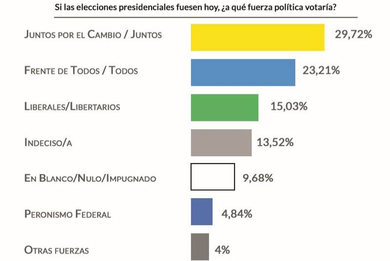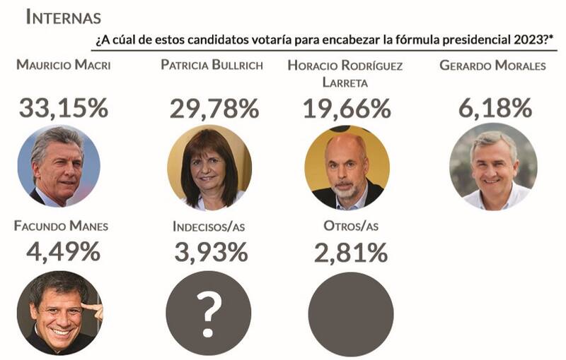 Con respecto a Juntos por el Cambio, espacio que puntea la encuesta con 29,72% por sobre el 23, 21% del Frente de Todos, se destacan los siguientes aspirantes: en cuanto a intención de voto "Patricia Bullrich (29.78%) y Mauricio Macri (33.15%) sostienen niveles similares a estudios anteriores, al contrario de Horacio Rodríguez Larreta, que perdió un 4.84%".