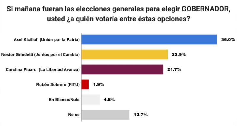 En este sentido, y pese al escándalo de Insaurralde, Kicillof se impondría con el 36% de los votos. Y le seguiría Néstor Grindetti, de Juntos por el Cambio, con el 22,9% de los votos. En tanto, Carolina Píparo, de La Libertad Avanza, le pisaría los talones con el 21,7% de los votos.