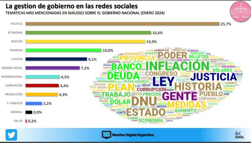En consonancia con el contexto actual el 25% de la conversación de redes sociales sobre el gobierno se concentró en el aspecto político, muy por sobre el económico que capturó el 16,6%.