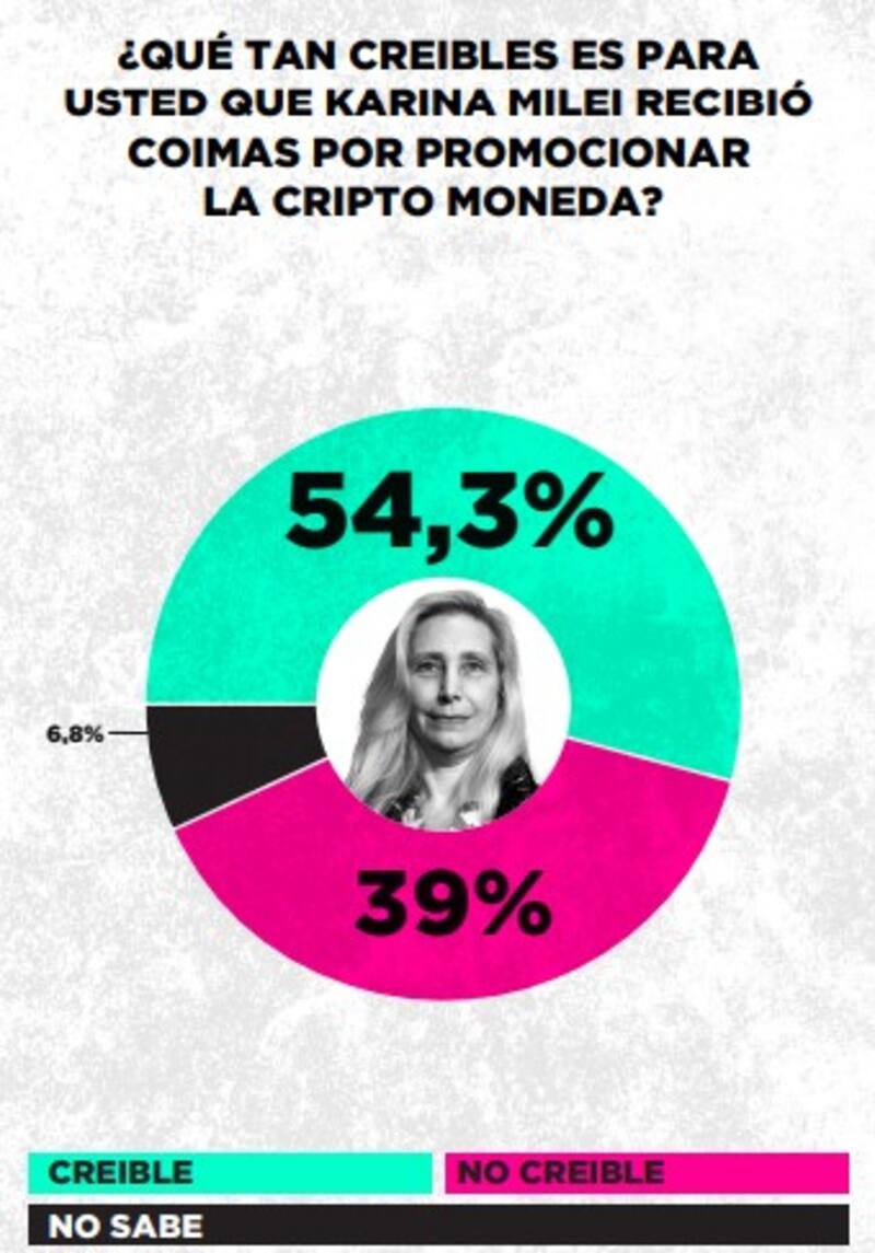 Puntualmente, la consulta fue "¿qué tan creíble es para usted que Karina Milei recibió coimas por promocionar la criptomoneda?". Más de la mitad consideró "creíble" la acusación contra la hermana del mandatario por esa promoción. El resultado fue 54,3% de acuerdo y 39% a favor.