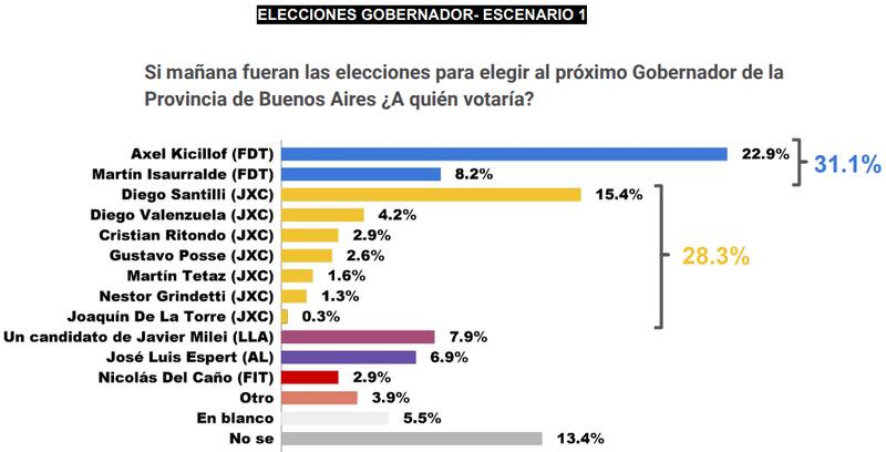 Ahora bien, si se dejara un único candidato por cada espacio, se impondría Santilli. Pero como la diferencia con Kicillof se ubica por dentro del margen de error, se podría hablar de un empate técnico o de un final abierto.