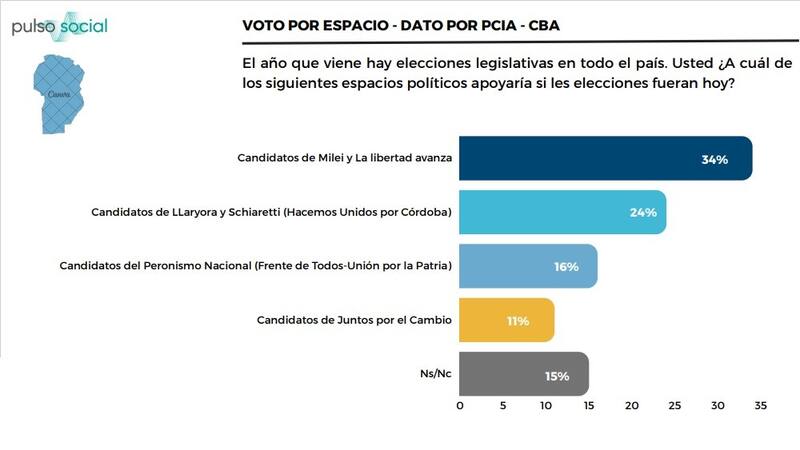 En Córdoba, Milei y sus candidatos representan al 35% de las adhesiones electorales mientras que el oficialismo local del cordobesismo se apunta un 24% de intención de voto y un 14% se lo lleva el Peronismo Nacional no Cordobesista.