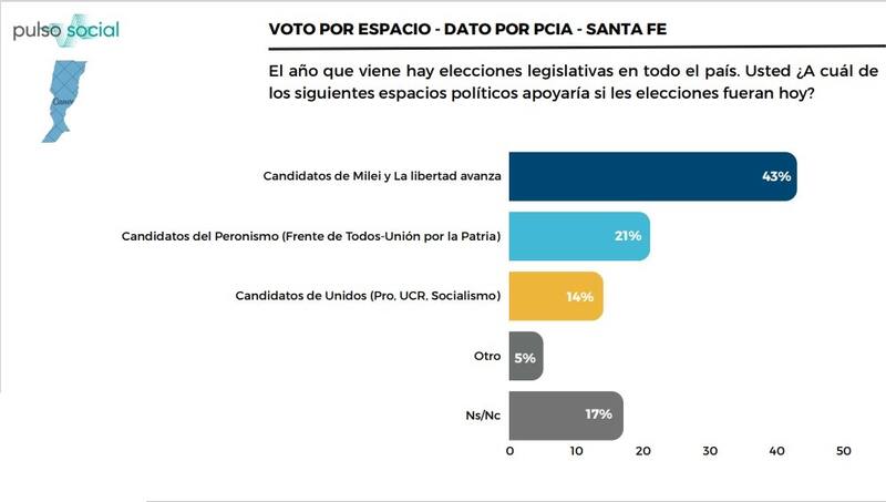 En Santa Fe es donde mejor le va a La Libertad Avanza que concentra un 43% de intención de voto. El dato relevante de 2023 es que se trata de un territorio donde se debió conformar un mega-frente opositor -radicalismo, socialismo, PRO y provinciales- para derrotar al peronismo y poner a Maximiliano Pullaro al frente. La secretaria general de la Presidencia, Karina Milei, busca consolidar el espacio propio de la mano de referentes como la diputada Romina Diez.