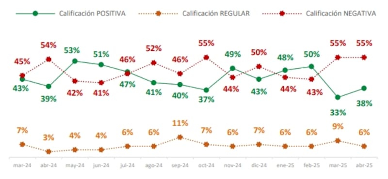 La calificación negativa se mantiene en su resultado más alto desde marzo de 2024, pero a diferencia de marzo pasado, la valoración positiva del gobierno de Milei sube de 33 a 38 puntos.