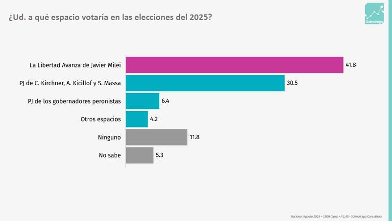 Al ser consultado sobre las elecciones del año 2025, un 41,8% prefiere a La Libertad Avanza de Javier Milei por sobre el resto de la oferta de espacios políticos. En los otros segmentos, el PJ de CFK, Kicillof y Sergio Massa acumula un 30,5%; PJ de los gobernadores peronistas un 6,4%; mientras que otros espacios tiene 4,2%. Las opciones "ninguno" y "no sabe", tienen 11,8% y 5,3%.