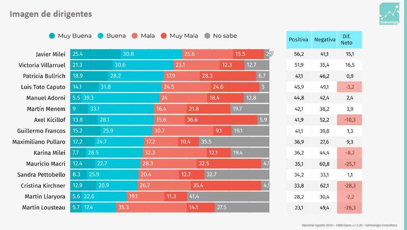 El jefe de Estado, Javier Milei (56,2%); la vicepresidenta, Victoria Villarruel (51,9%); y la ministra de Seguridad, Patricia Bullrich (47,1%); se mantienen en el podio de funcionarios con mayor imagen positiva del gobierno. Según Solmoirago, esto puede extrapolarse al ámbito nacional, sin dirigentes de la oposición que los superen en esa categoría.
