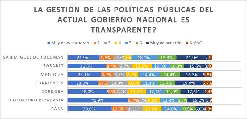 Los encuestados en Tucumán fueron los que evaluaron con mayor positividad la transparencia en sus políticas públicas. En contraposición, en Comodoro Rivadavia las valoraciones negativas alcanzaron el 49%, al mostrarse "muy en desacuerdo" el 42% y "en desacuerdo" el 7%.