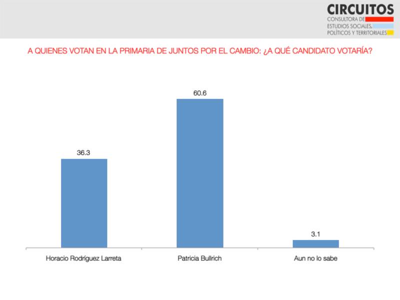 Dentro del universo indagado por Circuitos Consultora, Patricia Bullrichaparece como ganadora frente a Horacio Rodríguez Larreta por un amplio porcentaje de diferencia: se inclinaron por su fórmula un 60,6 % de los encuestados, mientras que a su rival lo eligió el 36,3 %. El resto de los electores se manifestó indeciso.