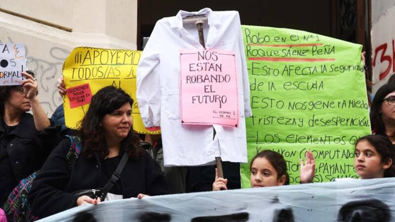En tanto, en la Escuela Normal Superior en Lenguas Vivas Nº 1 "Roque Sáenz Peña" y en la escuela Normal 1, estudiantes, docentes y familias realizaron esta mañana un abrazo simbólico a los establecimientos para pedir por seguridad educativa, ante los "reiterados robos". Solo en el Normal 1, la semana pasada, se llevaron 122 netbooks, más de 80 tablets, computadoras, proyectores, micrófonos, cámaras, mercadería de la cantina, entre otras cosas.