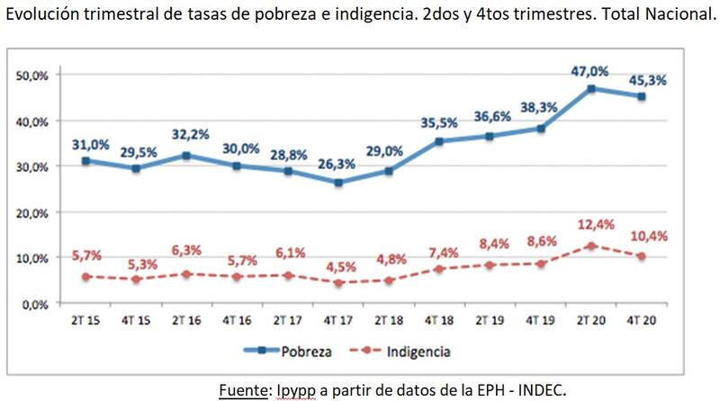 "Hacia el cuarto trimestre 2020, con la economía funcionando en niveles cercanos a los valores de la pre-pandemia, la pobreza se mantuvo apenas por debajo del altísimo nivel alcanzado durante el parate de la economía", señala el informe del Ipypp y resalta que, "de hecho, el 45,3% de pobreza en el cuarto trimestre implica un descenso de apenas 1,7 puntos porcentuales respecto al 47% registrado en el segundo trimestre".
