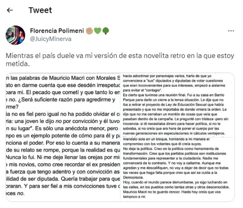 La exlegisladora publicó su descargo en Twitter, donde decidió dar su versión de lo que llama una "novelita retro en la que estoy metida". En un texto dividido en tres fotos, Polimeni cuenta que se sintió dolida por las palabras del expresidente, señala que este la agredió y descalificó por "decirle que no", define sus diferencias como una cuestión de convicciones y aclara que ella decidió irse, y no fue expulsada de la coalición como dijo el exmandatario.