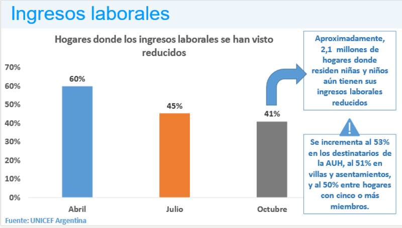 De acuerdo a la encuesta de Unicef, que es representativa de la totalidad de los hogares con niños, niñas y adolescentes del país, de todos los hogares con niños, niñas y adolescentes que enfrentan una reducción de ingresos laborales, alrededor del 70% de ellos perdió la mitad o más de la mitad de sus remuneraciones.