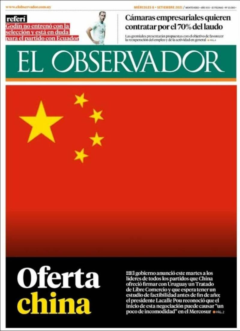 "Uruguay avanza con apuro en TLC bilateral con China, confiado en respaldo de Brasilahora que el gobierno de Xi Jinping ratificó su voluntad de avanzar bilateralmente tras la decisión de Uruguay de negociar por su cuenta", reportó el diario El Observador.