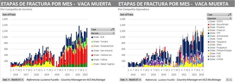 Son ocho las petroleras que hacen pozos en Vaca Muerta en este momento, a partir del Plan Gas y el crecimiento del petróleo. YPF lleva el liderazgo con 578 etapas, el 44,2% del total, debido a que cuenta con dos sets de fractura (uno de Schlumberger y otro de Halliburton) y su yacimiento estrella Loma Campana, en sociedad con Chevron.