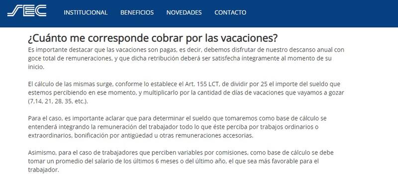 "Es importante destacar que, para determinar la extensión de las vacaciones, se computará la antigüedad que el trabajador tendría al 31 de diciembre del año al que correspondan las mismas", apunta el SEC.