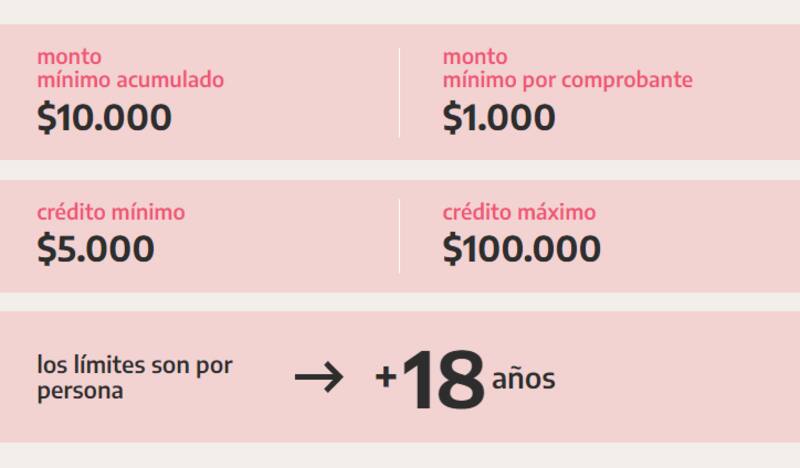 Los beneficios que se generen en el marco del programa tienen un mínimo de $ 5000 y un máximo de $ 100.000 por persona. Todos los límites son por persona, mayor de 18 años, siempre y cuando los comprobantes estén a su nombre.