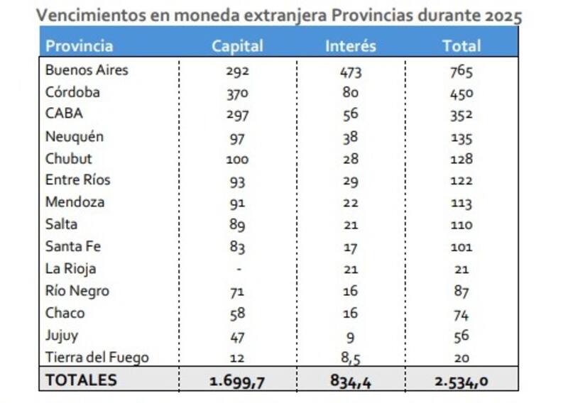 Entre las provincias, destacaron que apenas 4 de un total de 14 jurisdicciones concentran el 72% de los vencimientos de 2025. Se trata de Buenos Aires, Córdoba, CABA y Neuquén.