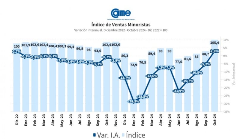 De esa manera, en la comparación mensual desestacionalizada, el Índice de Ventas Minoristas Pymes mostró un incremento en el consumo del 7,4% en octubre frente al mes previo. Sin embargo, a pesar de estas mejoras, el balance del año sigue en terreno negativo: en los primeros diez meses las ventas acumulan un declive del 13,2%.