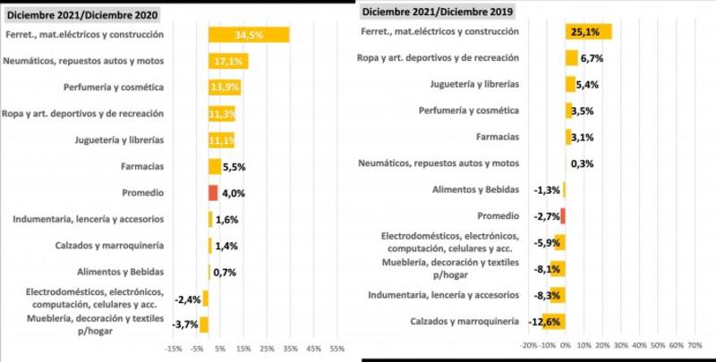 En tanto, en el rubro de alimentos y bebidas, las ventas en diciembre registraron un aumento de 0,7% anual y de 15,3% mensual, y en los rubros de electrodomésticos, artículos electrónicos, computación, celulares y accesorios, tuvieron una baja anual de 2,4% y una suba mensual de 13,1%.