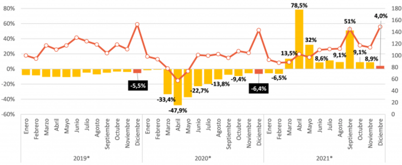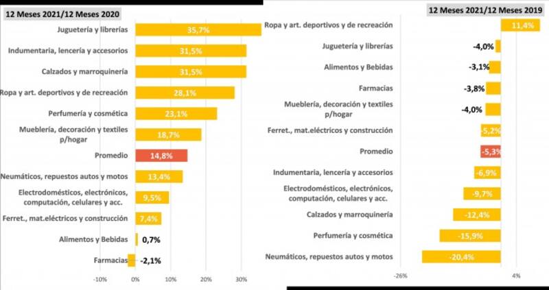 De ahí que en los 12 meses de 2021, "las ventas acumularon un alza de 14,8% frente a iguales meses de 2020 aunque se mantienen 5,3% debajo de iguales meses de 2019", concluyeron.