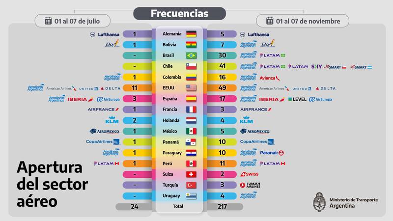 Actualmente ya están volando 22 compañías aéreas distintas con conexión directa a 16 países cuando en julio de este año sólo trabajaban 13 aerolíneas con 11 países conectados. Así, además de Aerolíneas Argentinas, ya se encuentran operando de forma internacional Lufthansa, Boliviana de Aviación, JetSmart Chile y Argentina, Latam Airlines, Latam Perú y Latam Brasil.