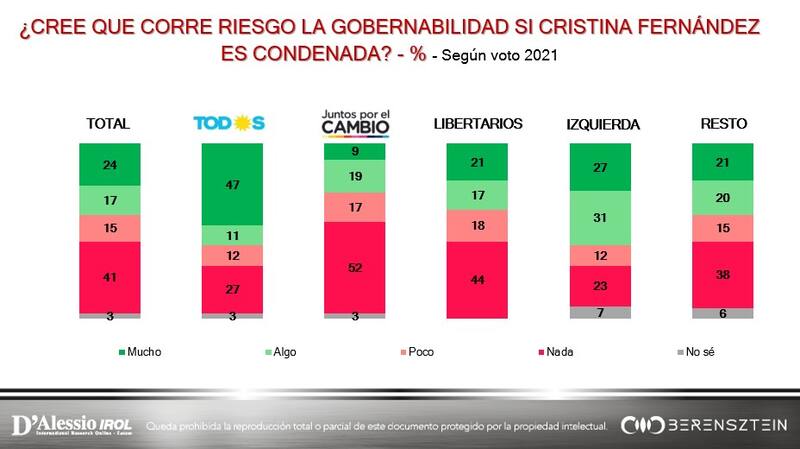 Por otro lado, se puso el foco en Cristina Kirchner, en particular sobre la causa Vialidad, en la que corre riesgo de ser condenada a fin de año. Para el 41% de los consultados, corre riesgo la gobernabilidad si la Vicepresidenta es condenada. Ese porcentaje sube al 58% entre los votantes del FDT. En cambio, baja al 28 si solo se toma en cuenta la opinión de quienes votaron a Juntos por el Cambio.